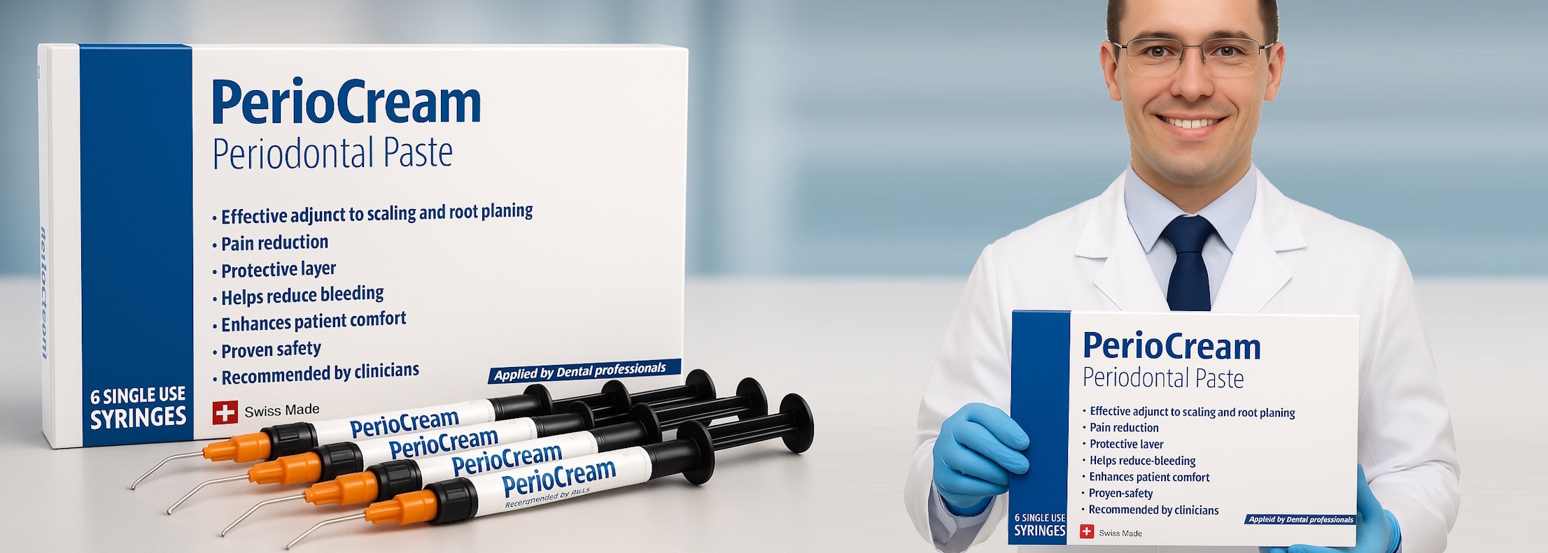 PerioCream Periodontal Paste is an adjunct to scaling and root planing (SRP) treatment applied by dental professionals on the gum line. PerioCream Periodontal Paste acts as a protective barrier by isolating inflamed gingiva and irritated oral tissues to prevent bacterial recolonization, help reduce bleeding and enhance natural healing. The product is clinically proven to significantly reduce pain after SRP, enhance patient comfort and improve the overall SRP experience.