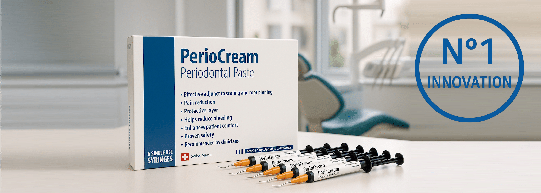 PerioCream Periodontal Paste as adjunct to SRP, applied on the gumline by dental professionals, acts as a protective barrier by isolating inflamed gingiva and irritated oral tissues to help reduce bleeding, enhance natural healing and prevent bacterial recolonization.